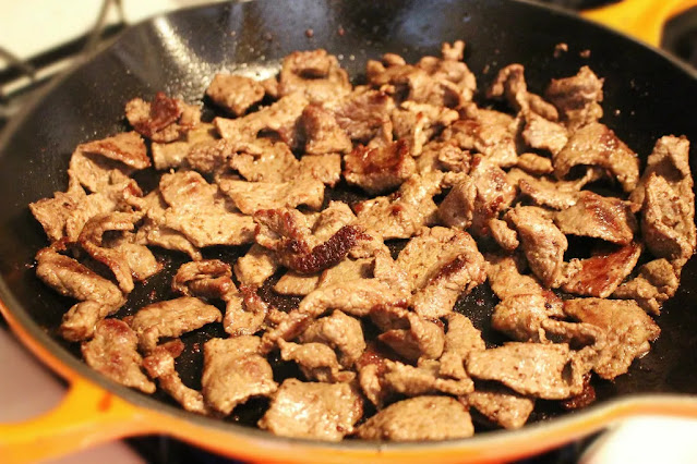 On a clean surface, slice your steak into 4-inch strips that are an 1/8 inch thick. Heat your olive oil in a skillet on medium-high heat, and add in the steak. Sprinkle the salt, pepper, onion powder, and garlic powder over the steak.